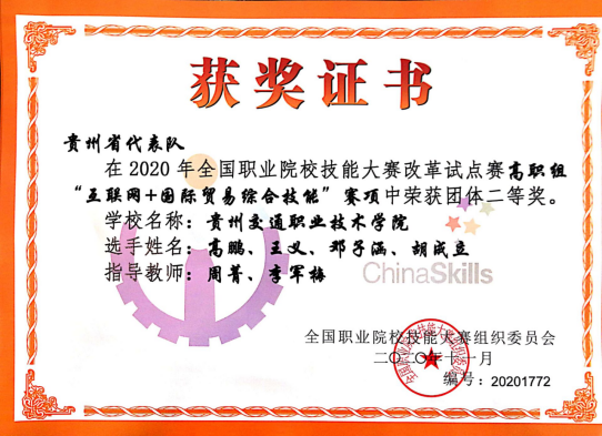 2020年11月17日至18日,2020年全国职业院校技能大赛(高职组)“互联网+国际贸易综合技能”竞赛在山东商院举办,我院物流工程系高鹏、王义、邓子涵、胡成立4位同学在周菁和李军梅老师的指导下,与来自全国其他各高校共29支队伍展开激烈角逐,最终斩获该赛项全国二等奖,为学校赢得了荣誉。