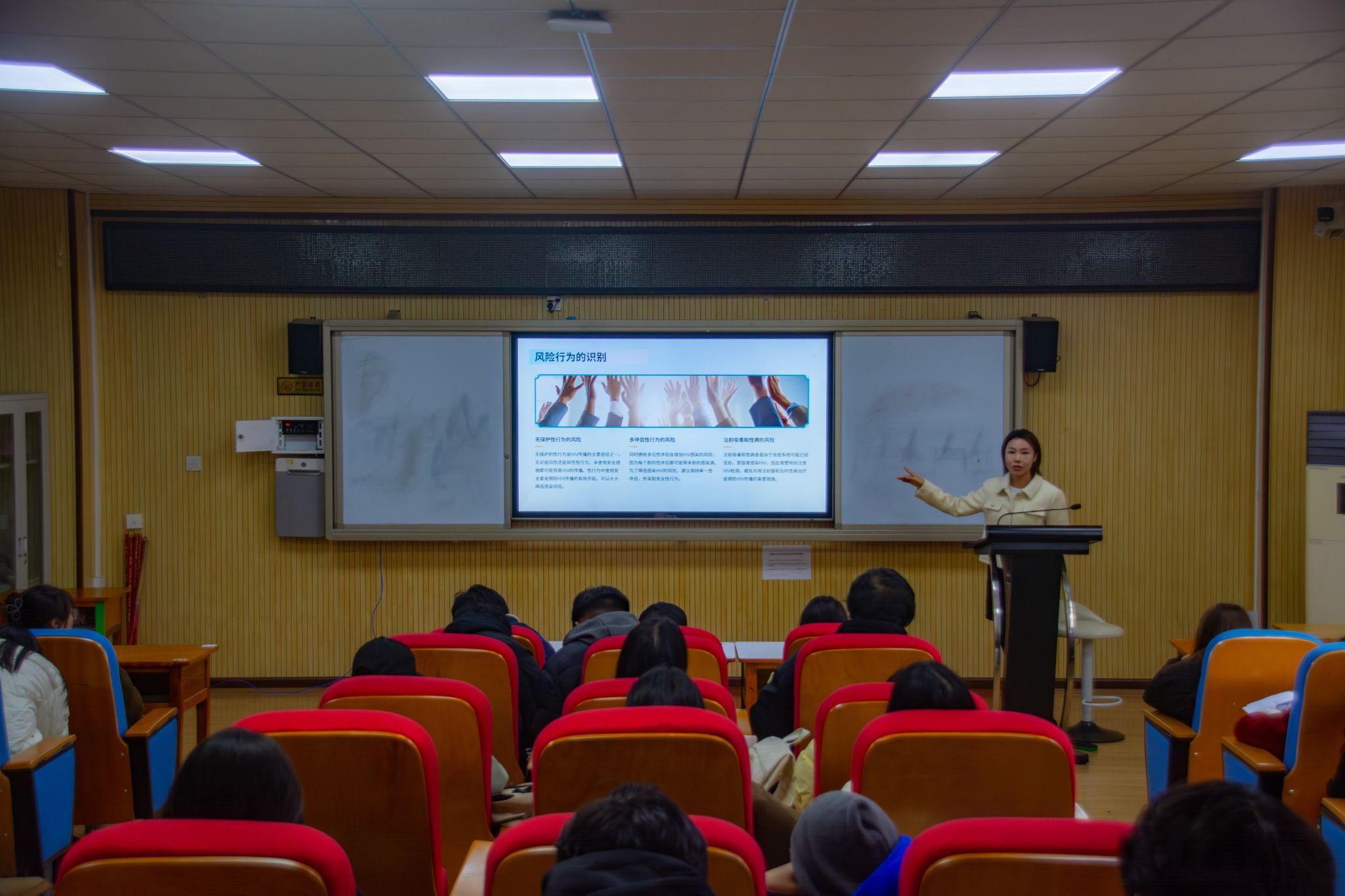 讲座中,李医生首先详细介绍了秋冬季常见疾病的预防知识,包括流感、肺炎等呼吸道疾病的传播途径、症状及预防措施,如接种疫苗、保持良好的个人卫生习惯等。随后,李医生着重强调了心灵关爱在健康管理中的重要性。研究表明,秋冬季日照时间缩短,人体生物钟容易受到影响,可能导致情绪波动、抑郁等心理问题。她建议同学们通过适度运动、保持规律作息以及积极的社交互动来缓解压力,维持心理健康。李医生还分享了一些简单易行的心理调适方法,如深呼吸放松练习和正念冥想等,帮助大家在繁忙的学习与工作中保持内心的平静与平衡。